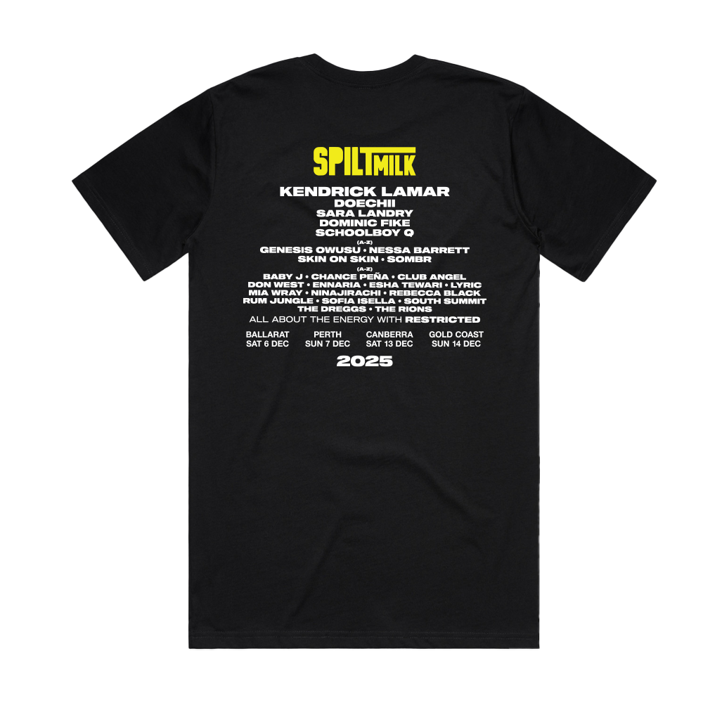 Rock the 2025 Block Tour in style with this official Spilt Milk tee. Printed on a premium 100% cotton AA1301 blank, it features the complete festival lineup on the back—your wearable proof of an epic summer. Soft, comfortable, and festival-ready, this tee is the perfect memento of the music, the moments, and the madness.